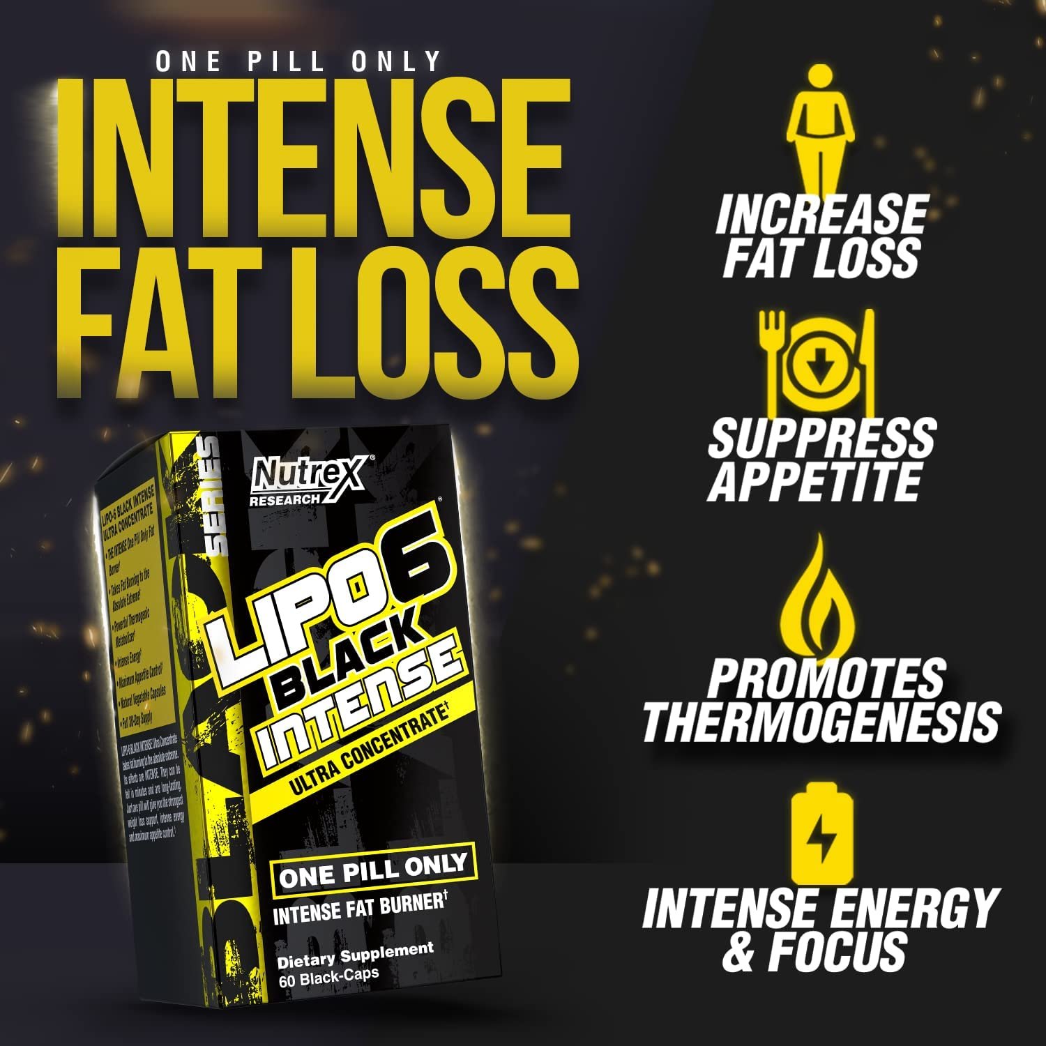 Probablemente estés familiarizado con LIPO-6 BLACK Ultra Concentrate. Bueno, hemos roto el molde y estamos introduciendo LIPO-6 BLACK INTENSE ULTRA CONCENTRATE. Nuestra última innovación lleva la quema de grasa al extremo absoluto. ¡Sus efectos son absolutamente INTENSOS! Se pueden sentir en minutos y son duraderos. Una sola píldora te dará el soporte para perder peso más fuerte y completo, una energía intensa y un control máximo del apetito. ¡Con LIPO-6 BLACK INTENSE ULTRA CONCENTRATE hemos empujado el sobre más lejos que nunca! ¡Solo una pastilla